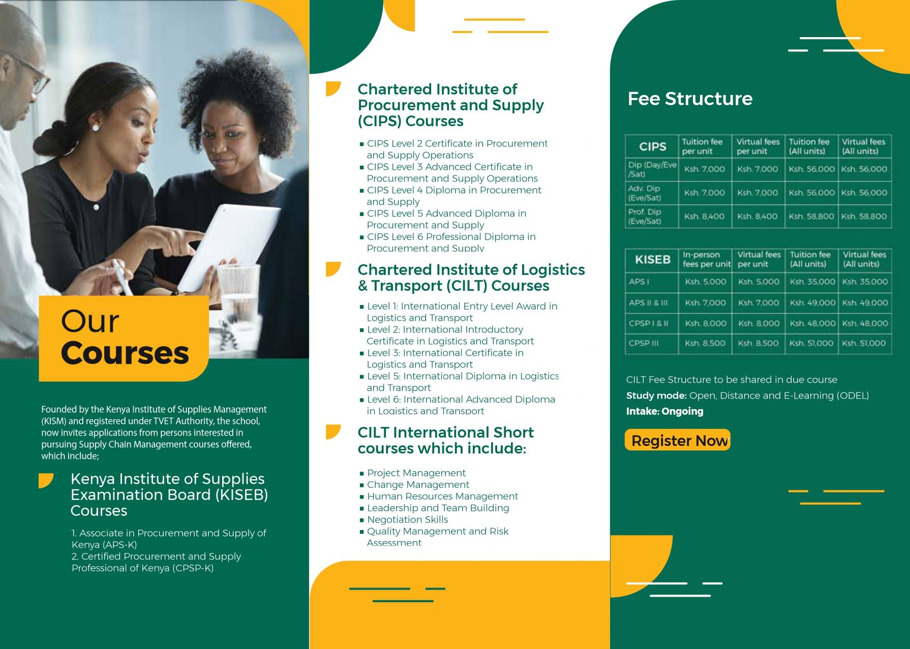 Kenya College of Supply Chain Management (KCSCM) specializes in offering high-quality education in supply chain management. We collaborate with esteemed institutions to provide industry-recognized qualifications and equip our students with essential skills.